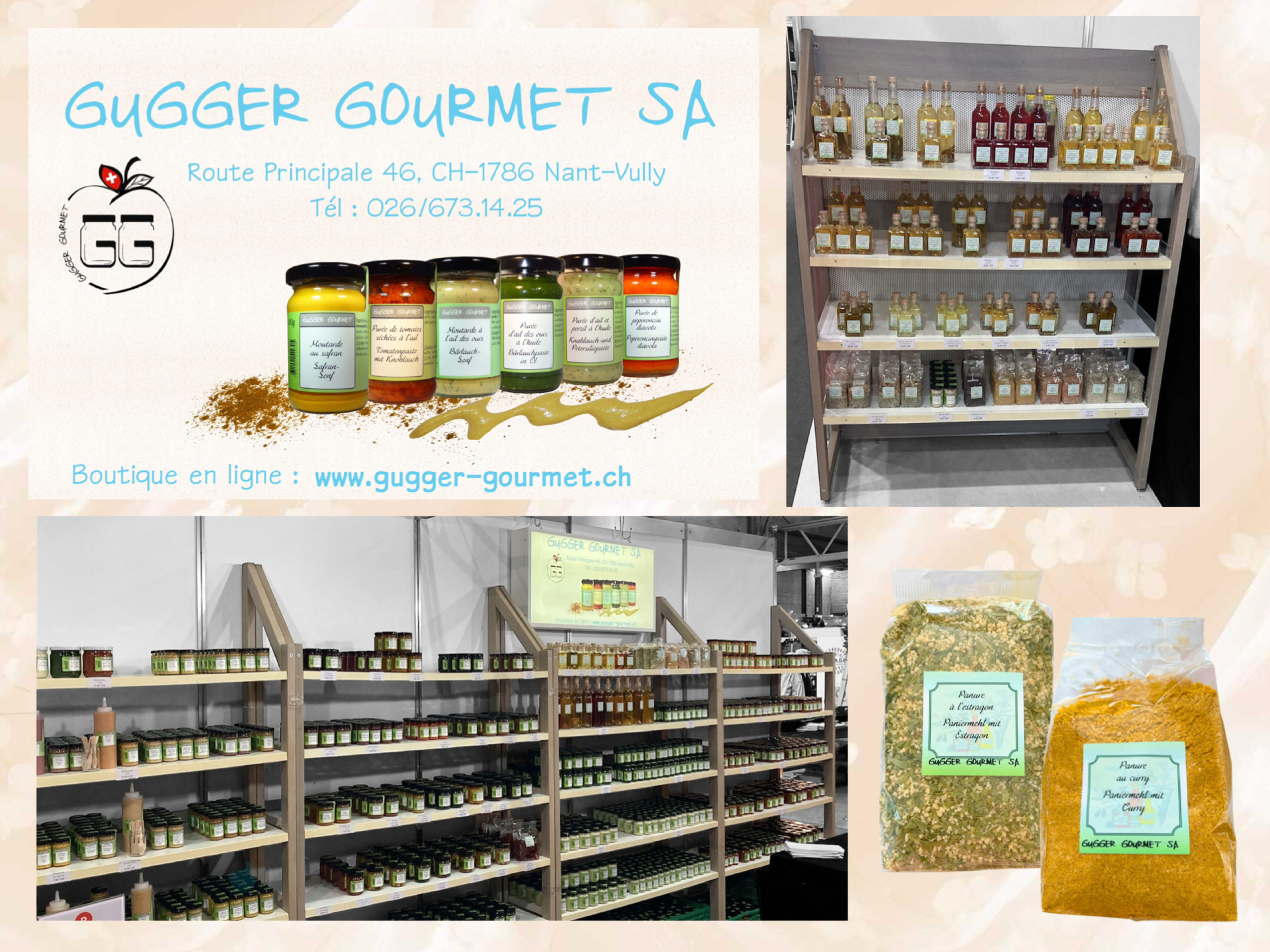 La signature Gugger Gourmet SA se décline en une collection riche et inspirée : confitures artisanales, moutardes aromatisées, purées d’herbes et d’ail à l’huile végétale, spécialités de tomates fraîches et séchées, conserves fines, panures aromatisées, assaisonnements, huiles et vinaigres aromatisés, sauces savoureuses. Chaque recette est pensée pour accompagner aussi bien la cuisine du quotidien que les plus belles tables. Les textures sont justes, les arômes précis, les équilibres maîtrisés. Le résultat : des produits qui transforment un plat simple en véritable expérience gastronomique.