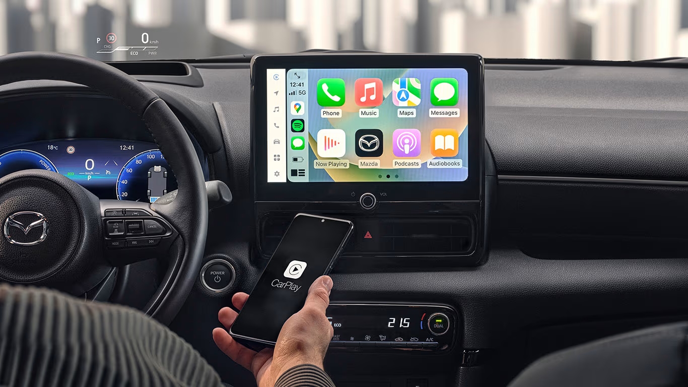 L’habitacle de la Mazda 2 Hybrid se distingue par ses technologies avancées et ses finitions élégantes. Selon les niveaux de finition, l’équipement comprend un écran d’infodivertissement jusqu’à 10,5 pouces, une connectivité Apple CarPlay® et Android Auto™, ainsi qu’un affichage tête haute. Les versions haut de gamme Homura Plus ajoutent un toit vitré panoramique, des sièges mi-cuir et un éclairage LED intérieur pour une ambiance premium. En termes de sécurité, la Mazda 2 Hybrid est équipée de systèmes de pointe comme l’aide au stationnement et la reconnaissance active des obstacles.